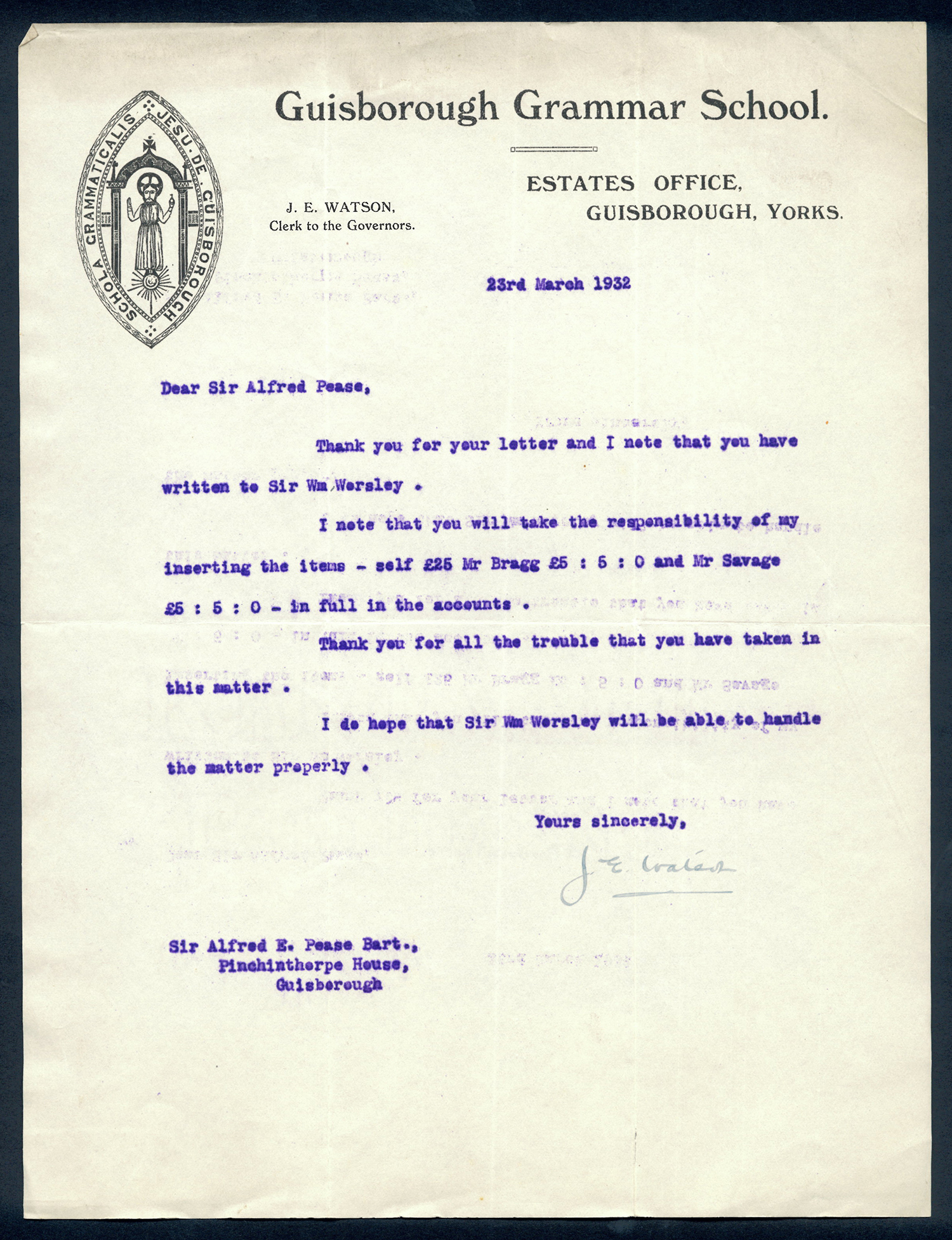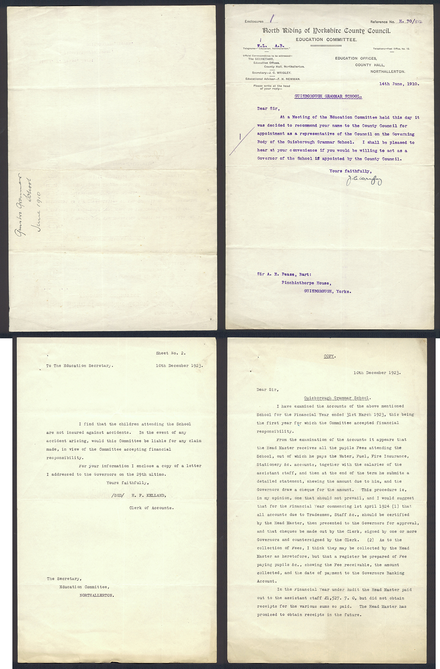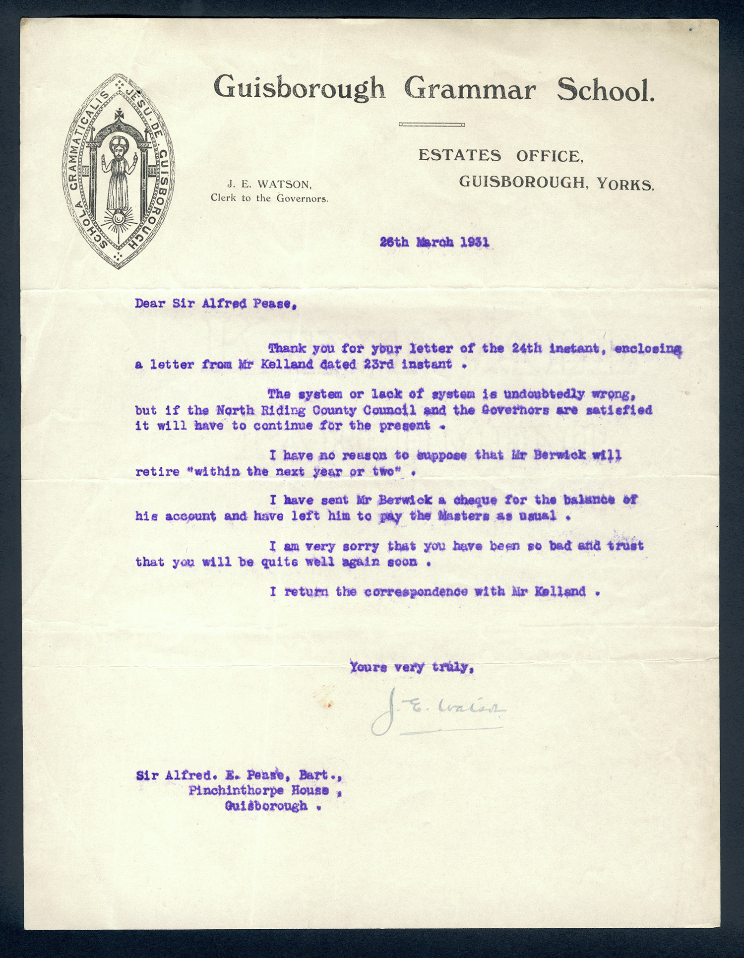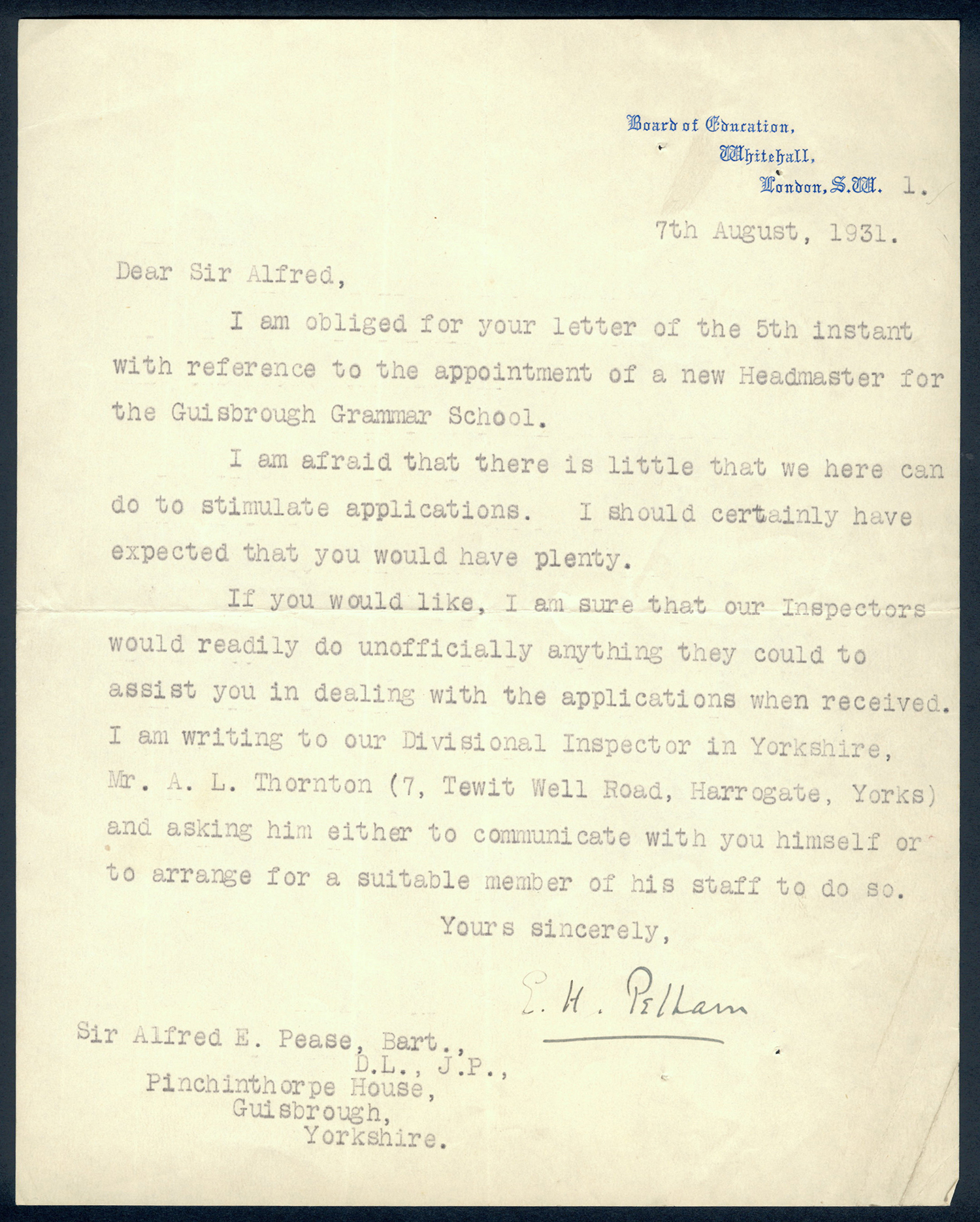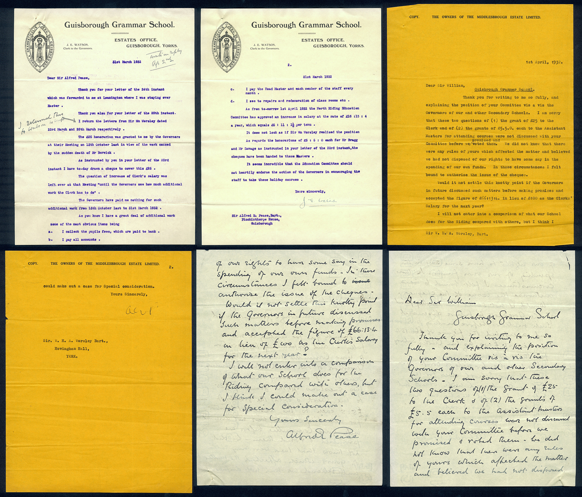 This section holds our collection of letters of Sir Alfred Pease, some of which were written by Headmasters of Guisborough Grammar School.
