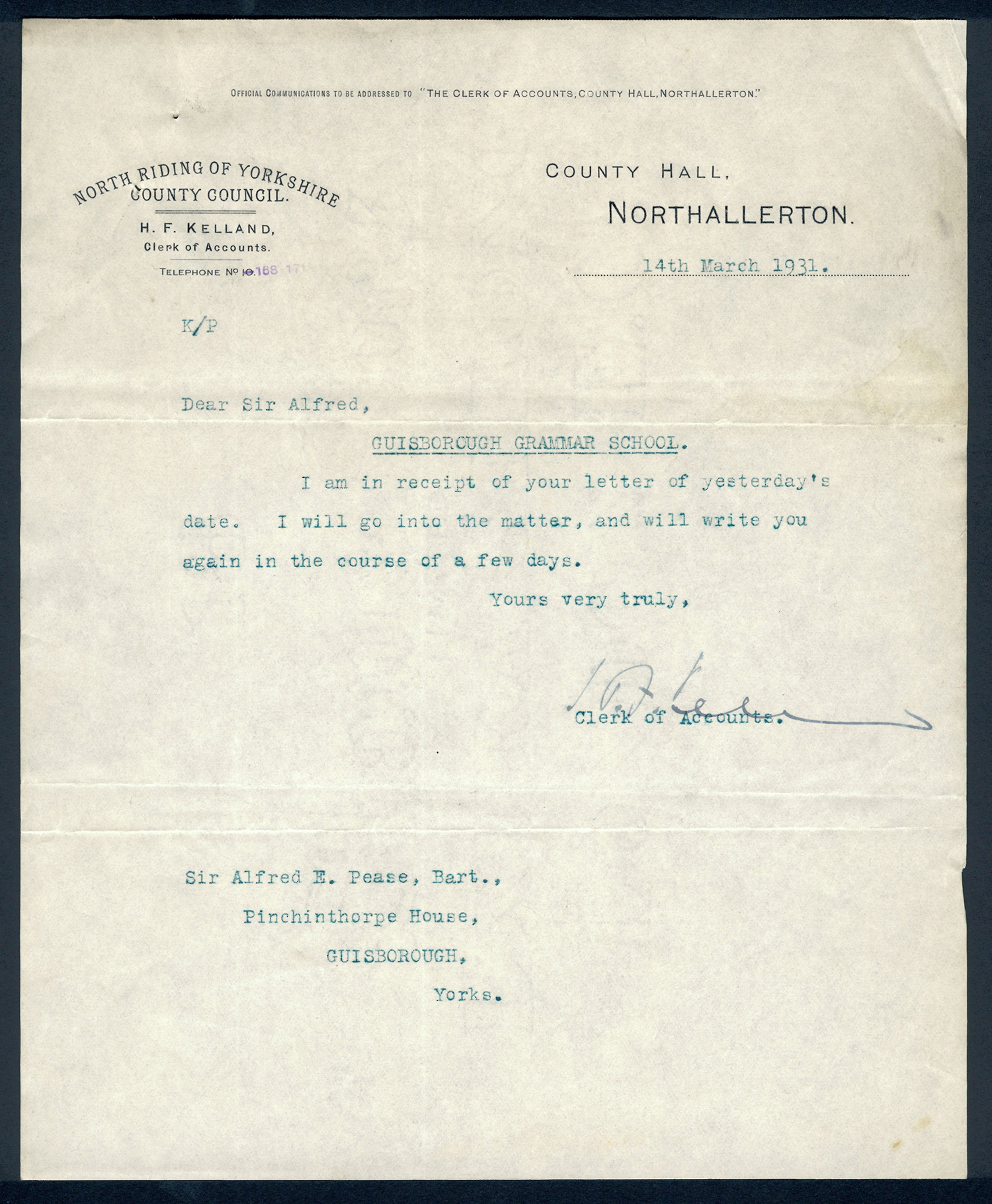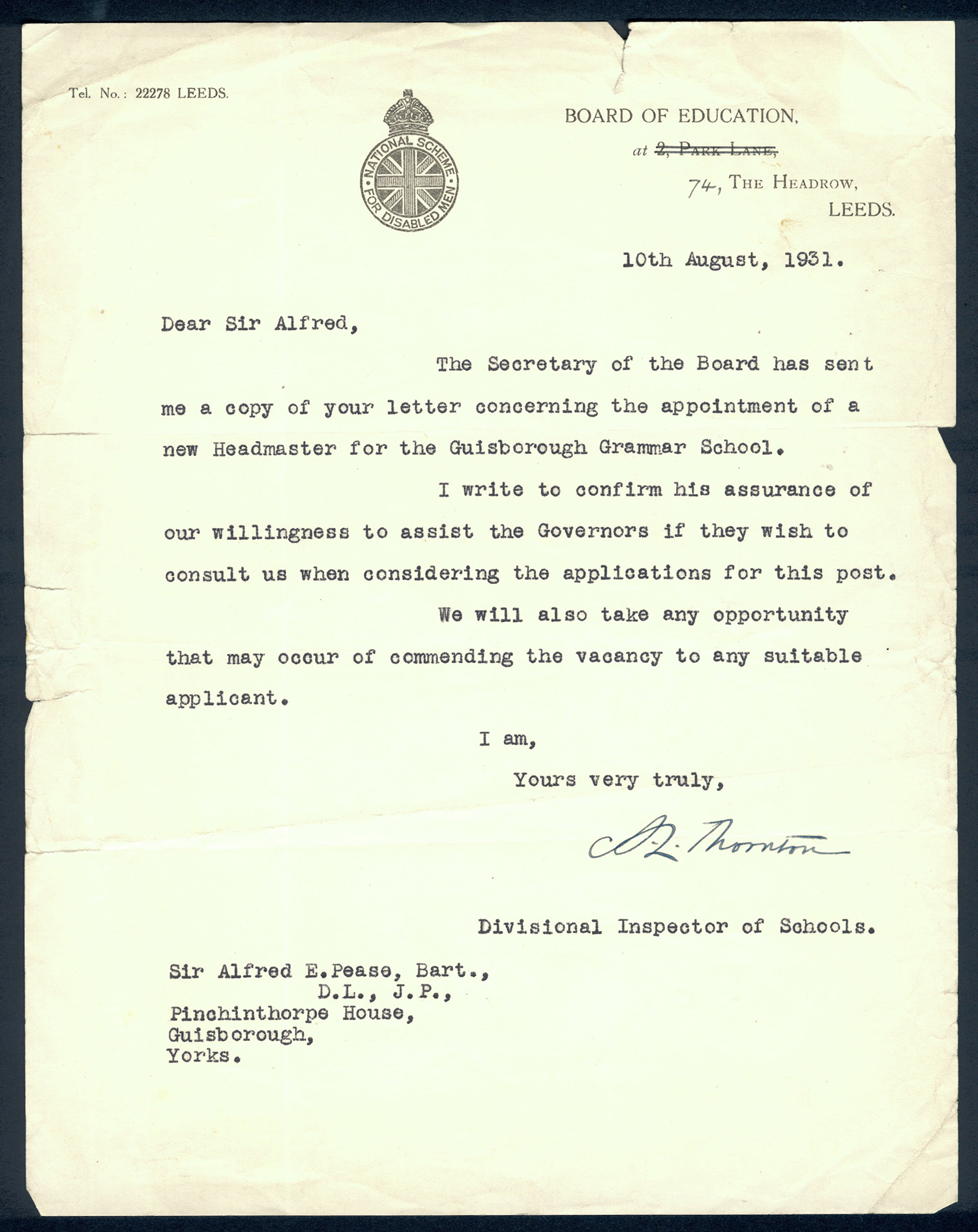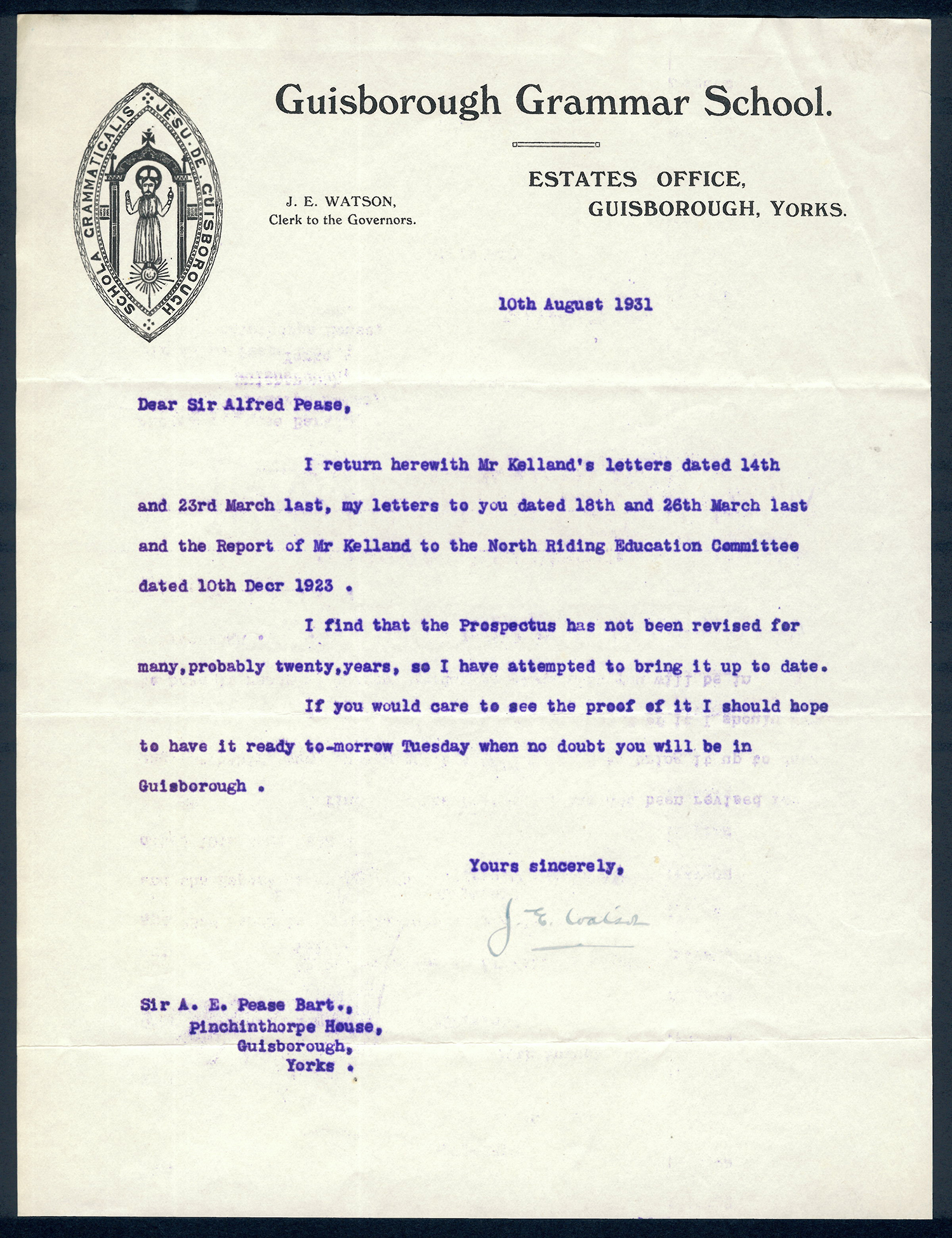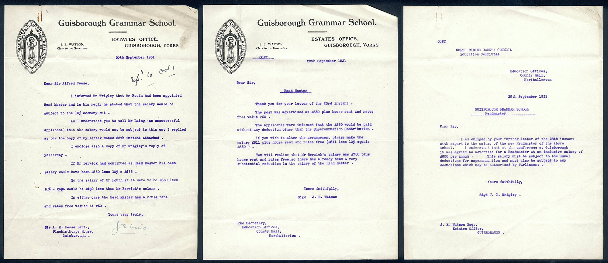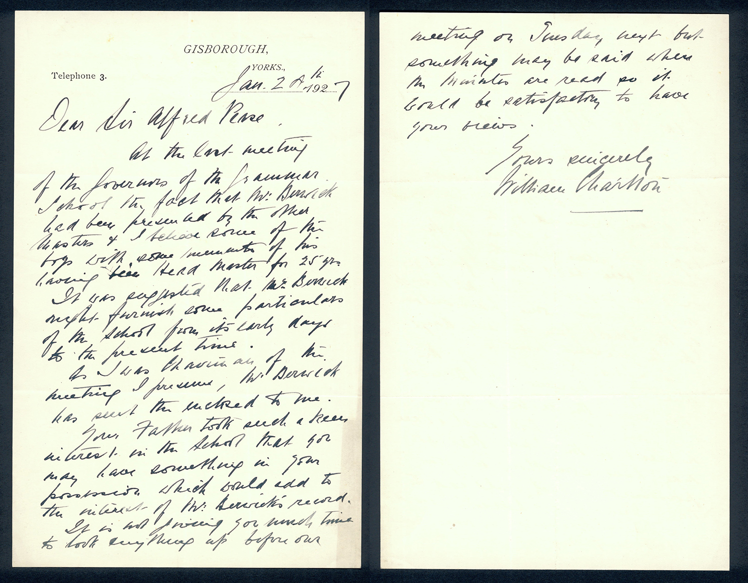 This section holds our collection of letters of Sir Alfred Pease, some of which were written by Headmasters of Guisborough Grammar School.