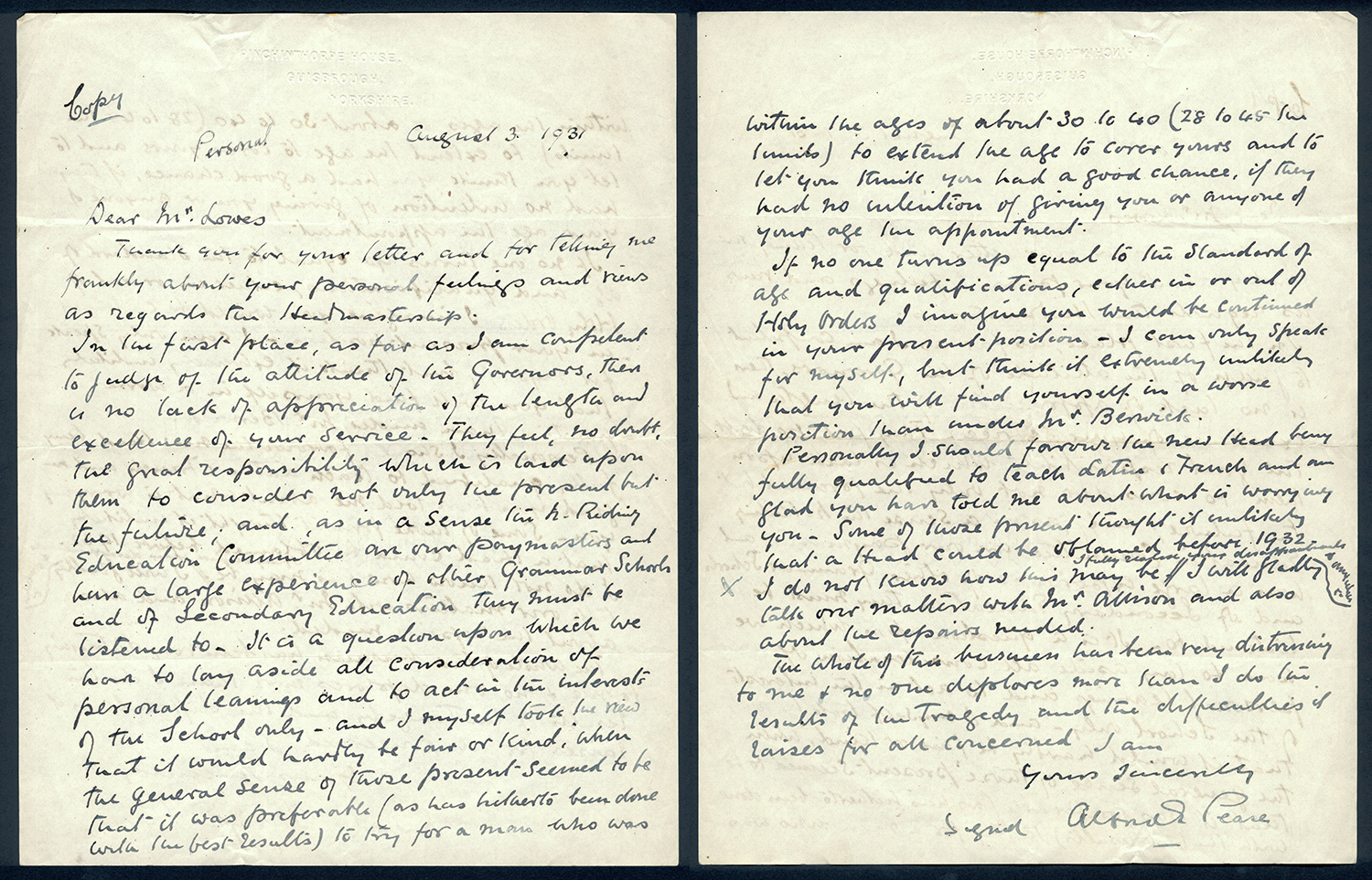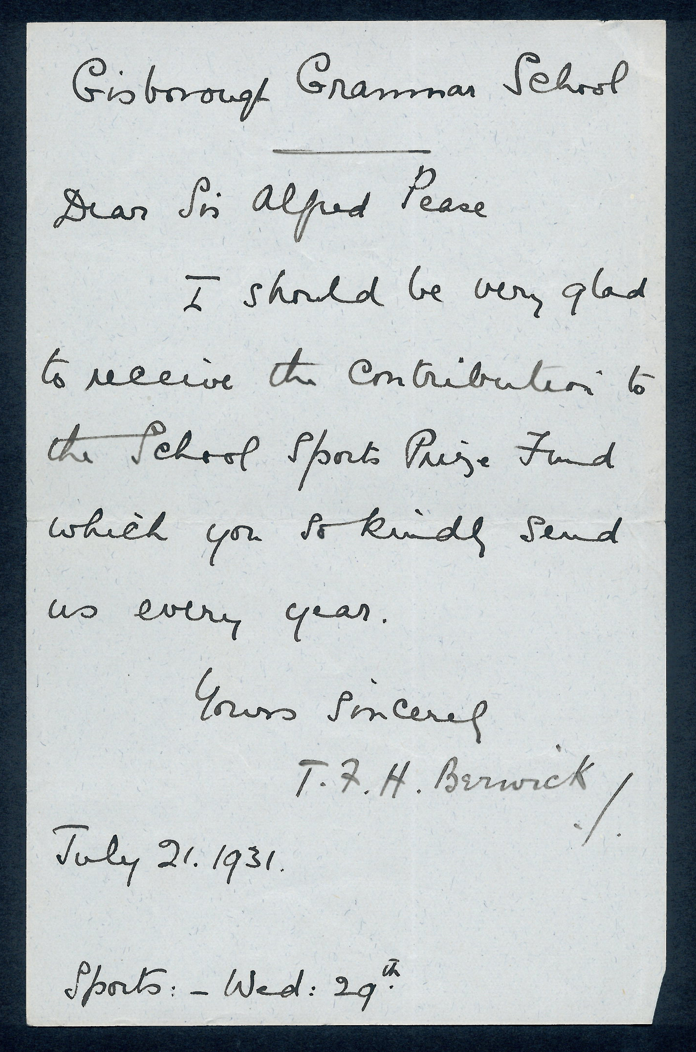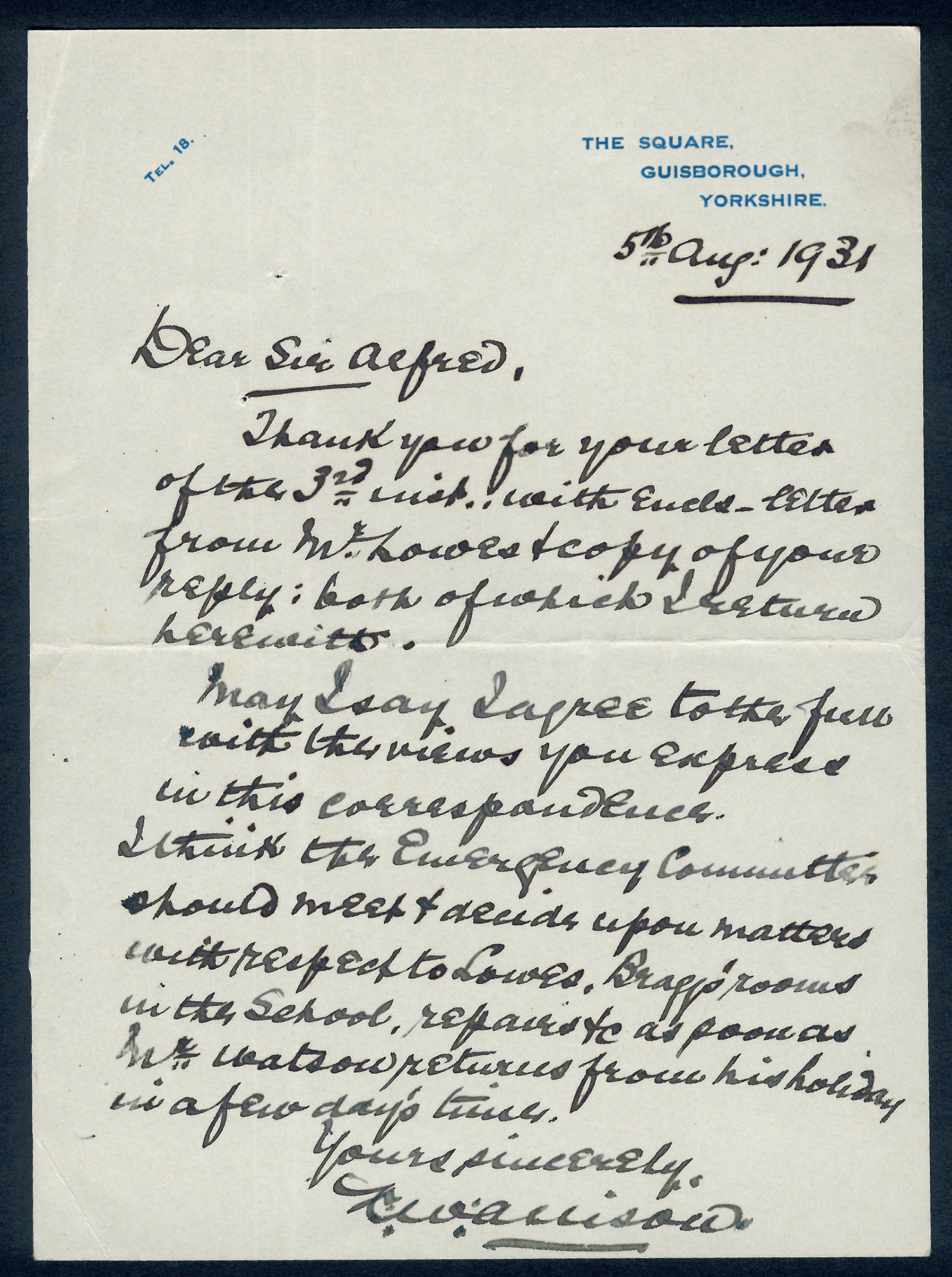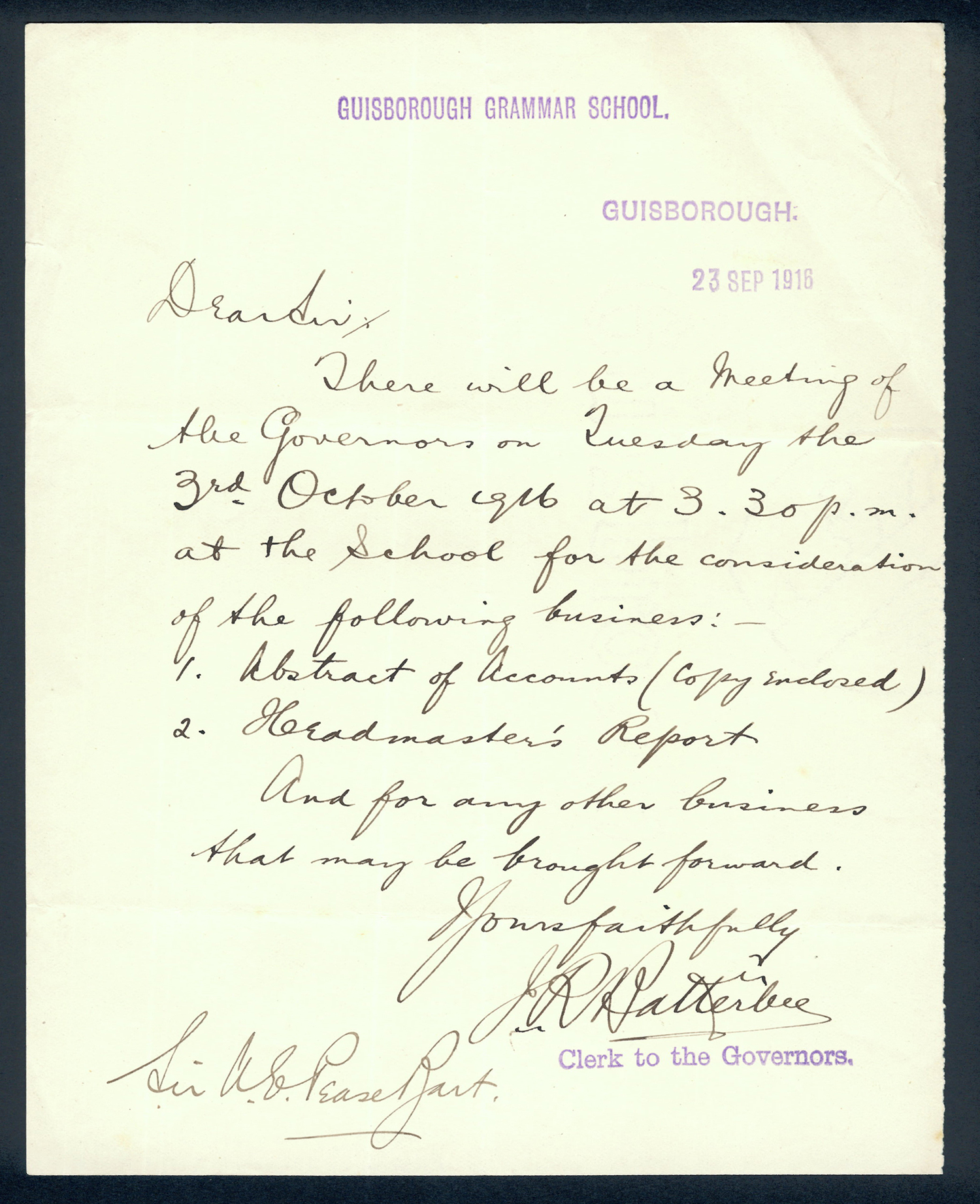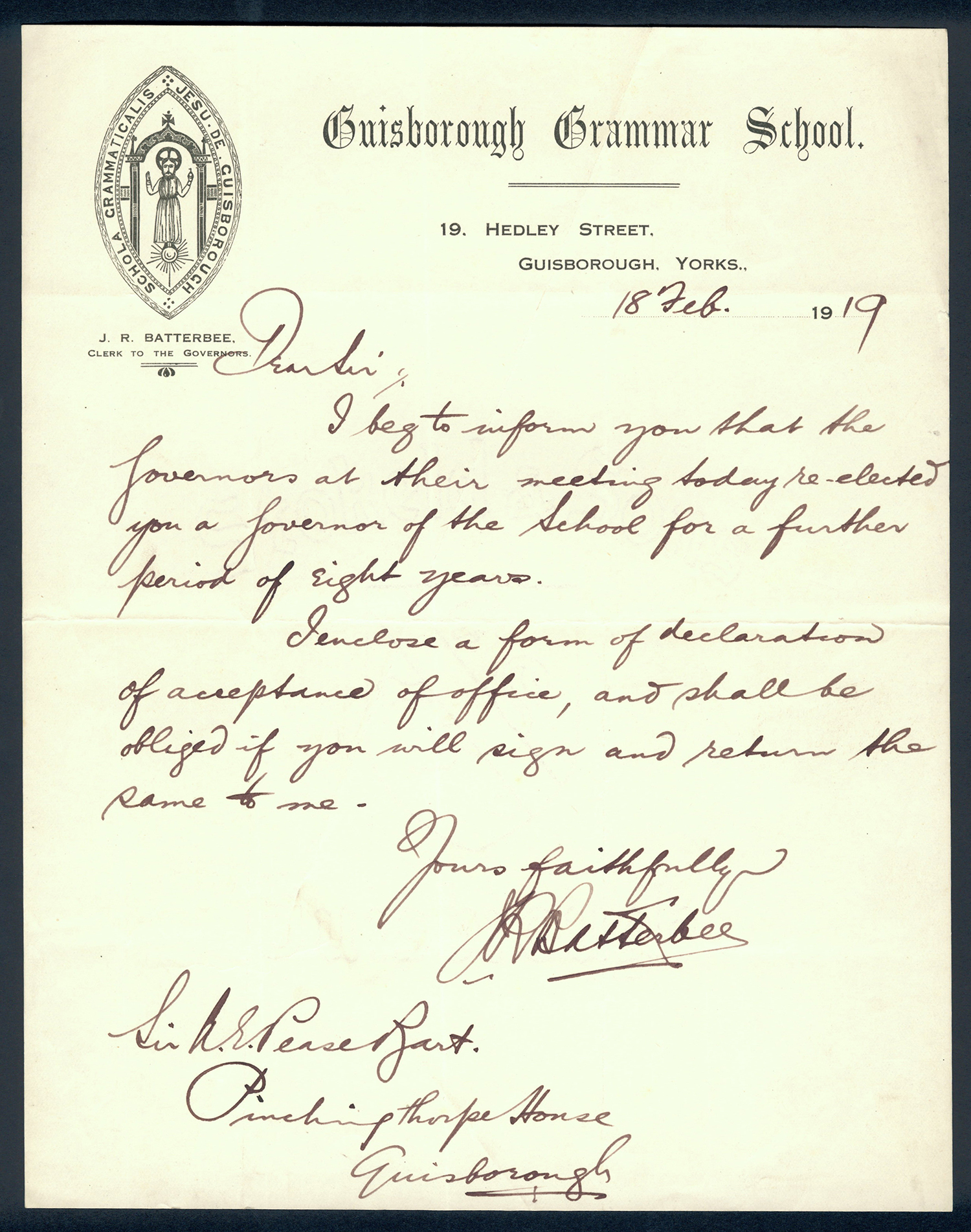 This section holds our collection of letters of Sir Alfred Pease, some of which were written by Headmasters of Guisborough Grammar School.