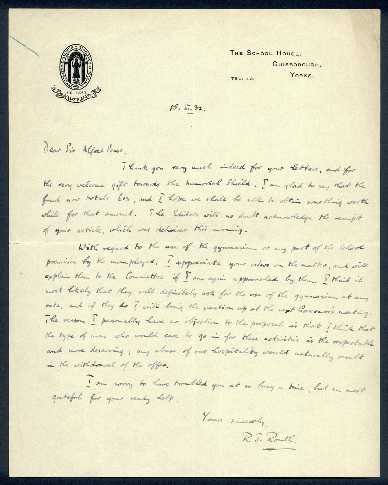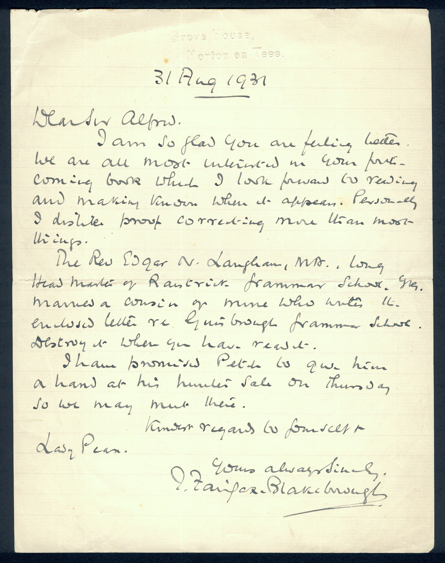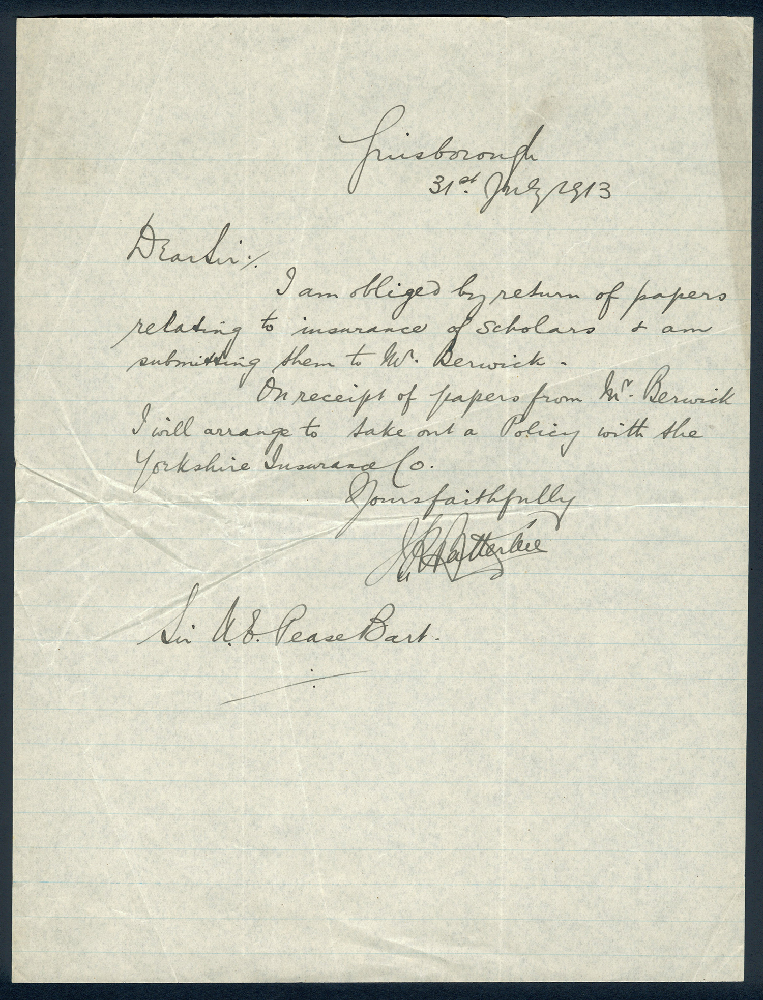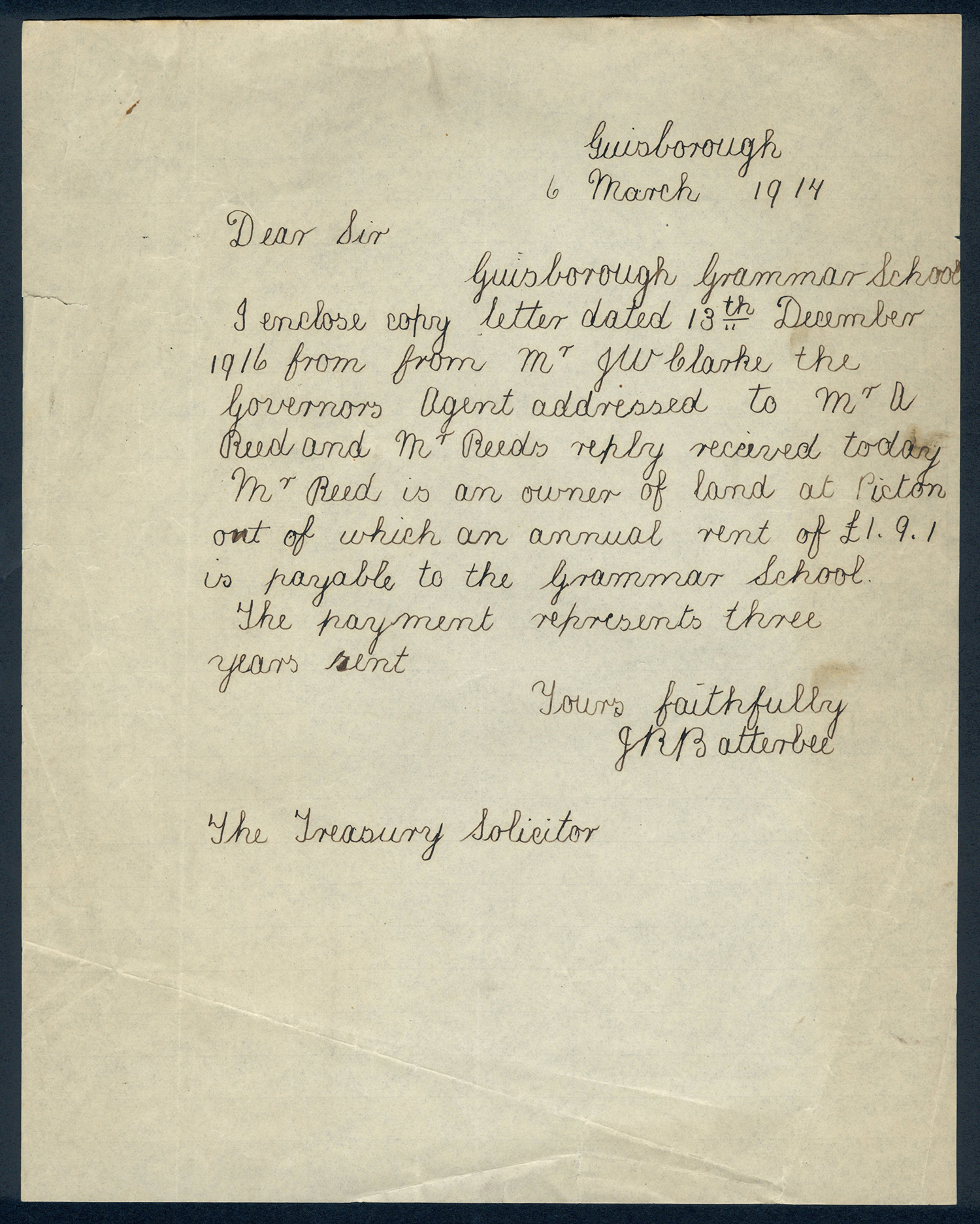 This section holds our collection of letters of Sir Alfred Pease, some of which were written by Headmasters of Guisborough Grammar School.
