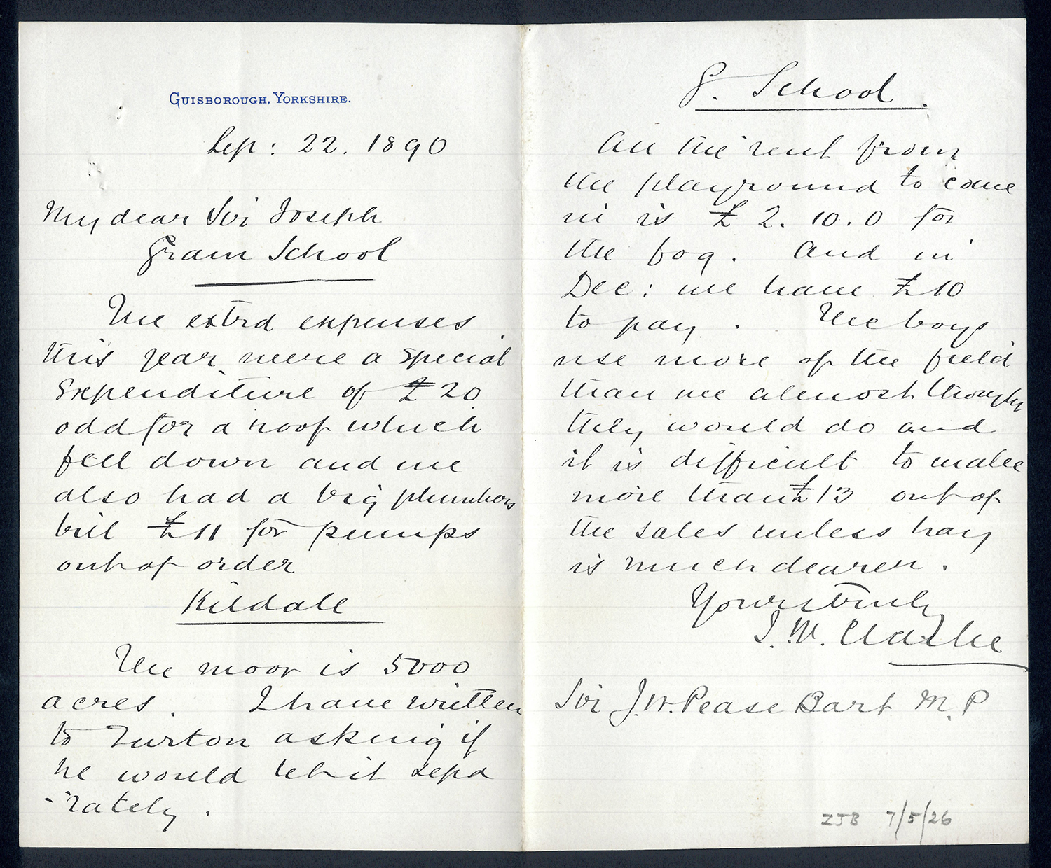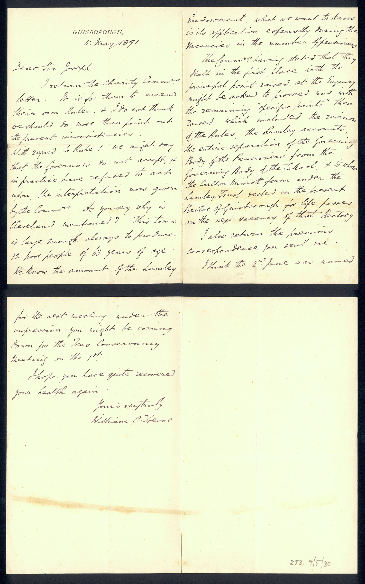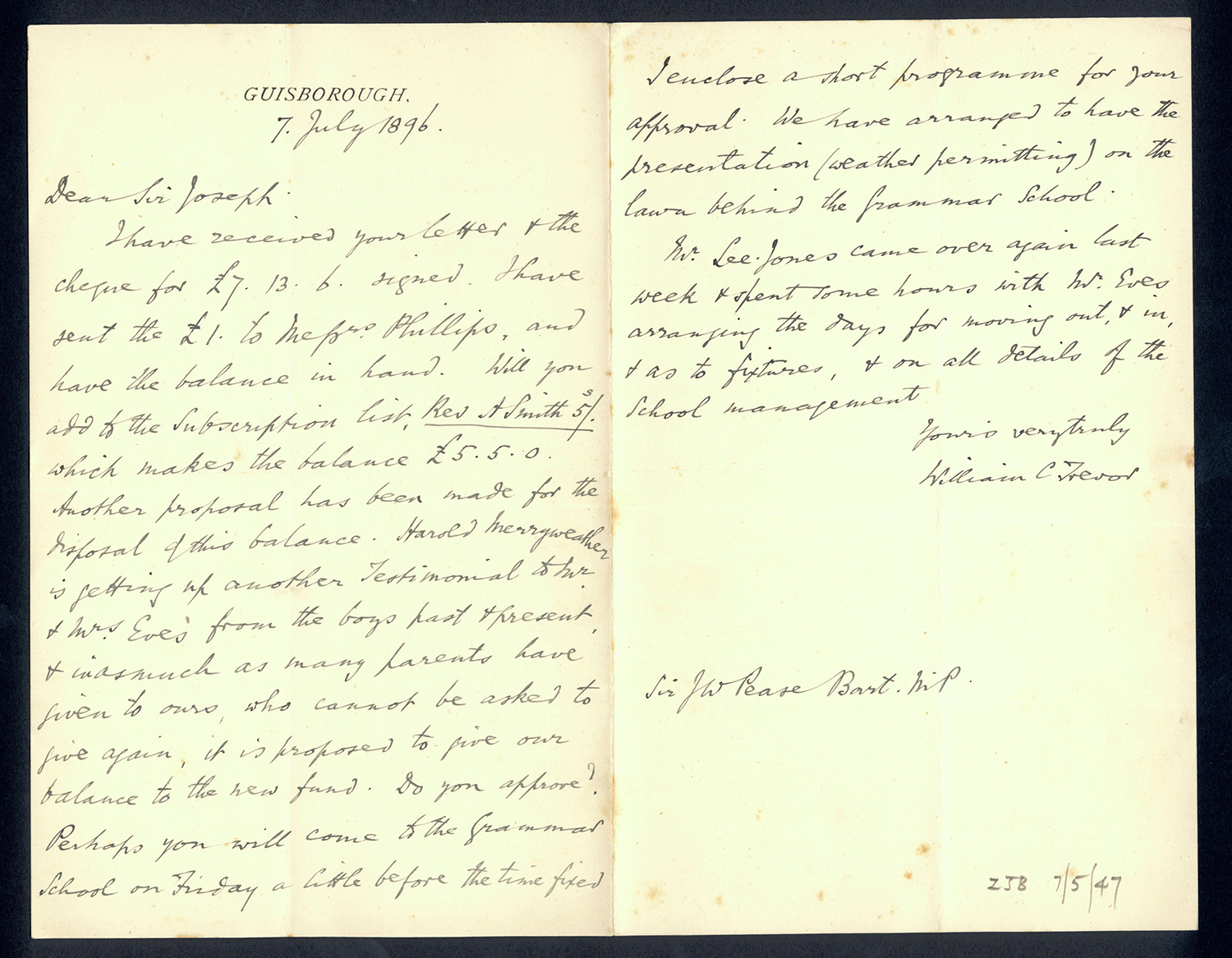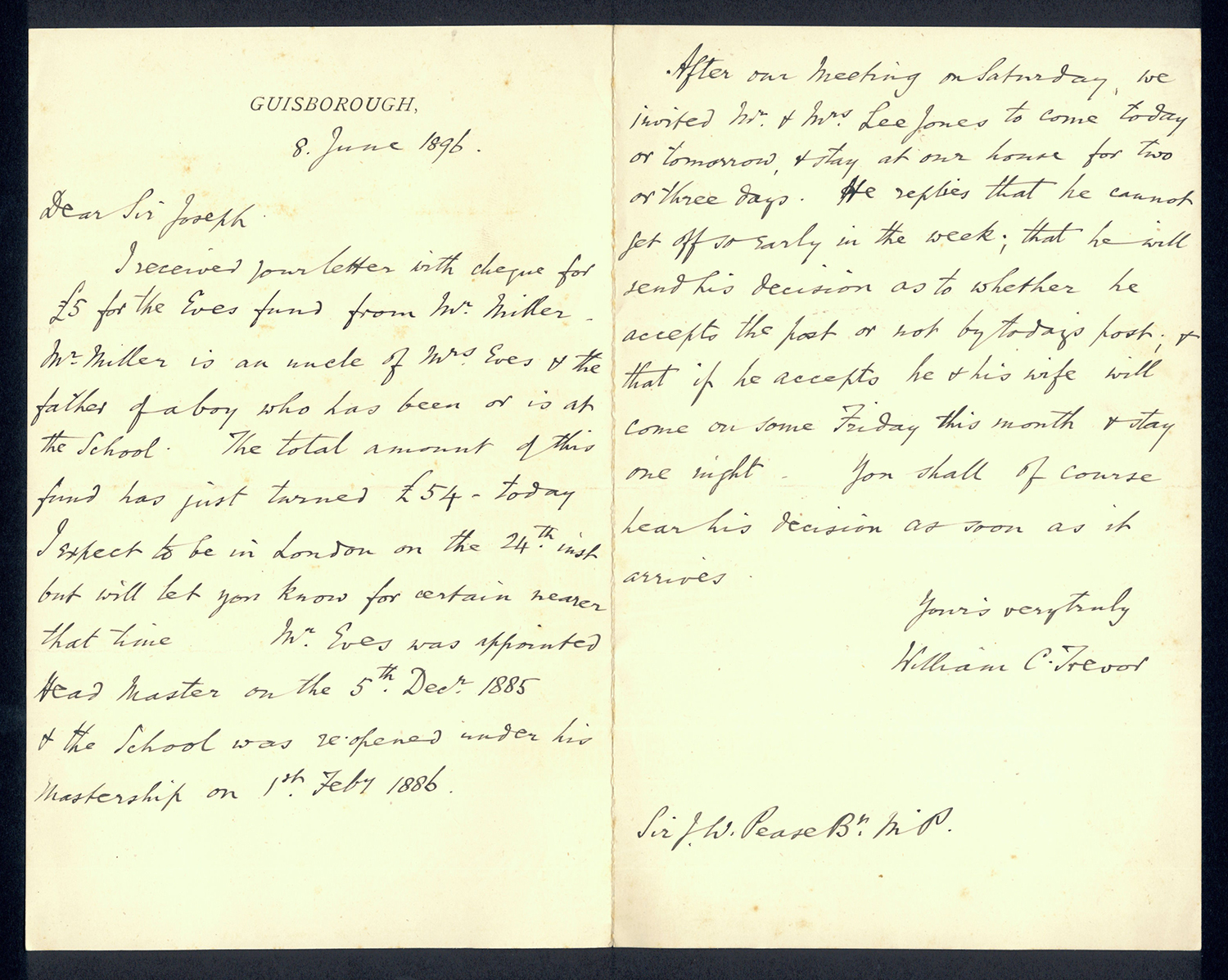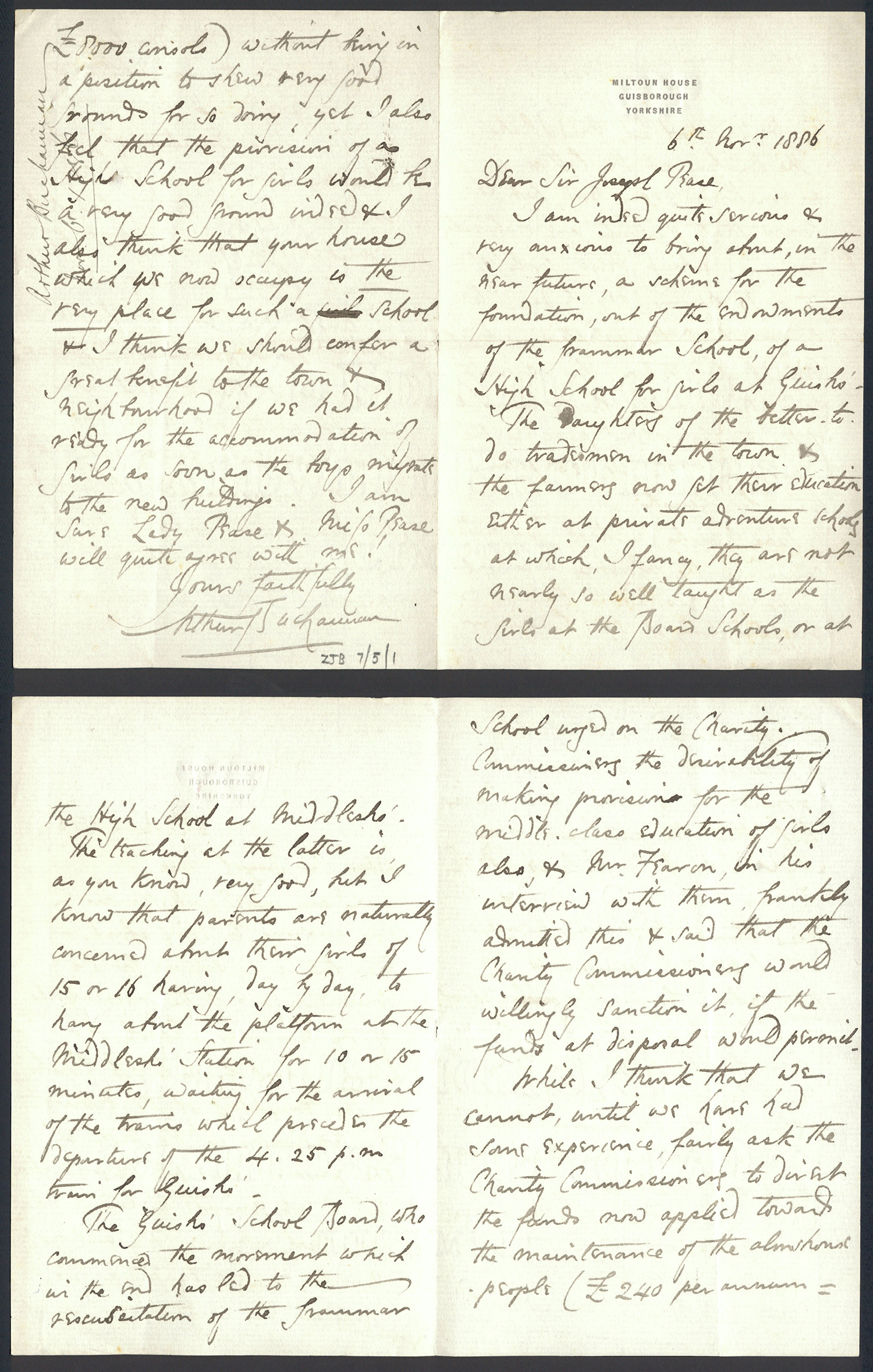 Sir Joseph Pease was the guiding force beind the reconstitution of Guisborough Hospital into Guisborough Grammar School in the 1880s. These letters date from 1886 to 1900, and form an interesting record of the very early years of Guisborough Grammar School.