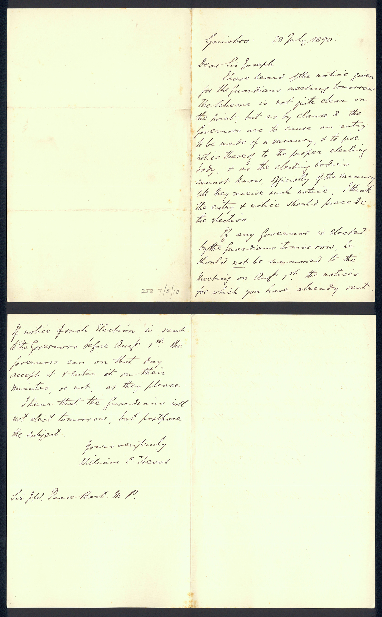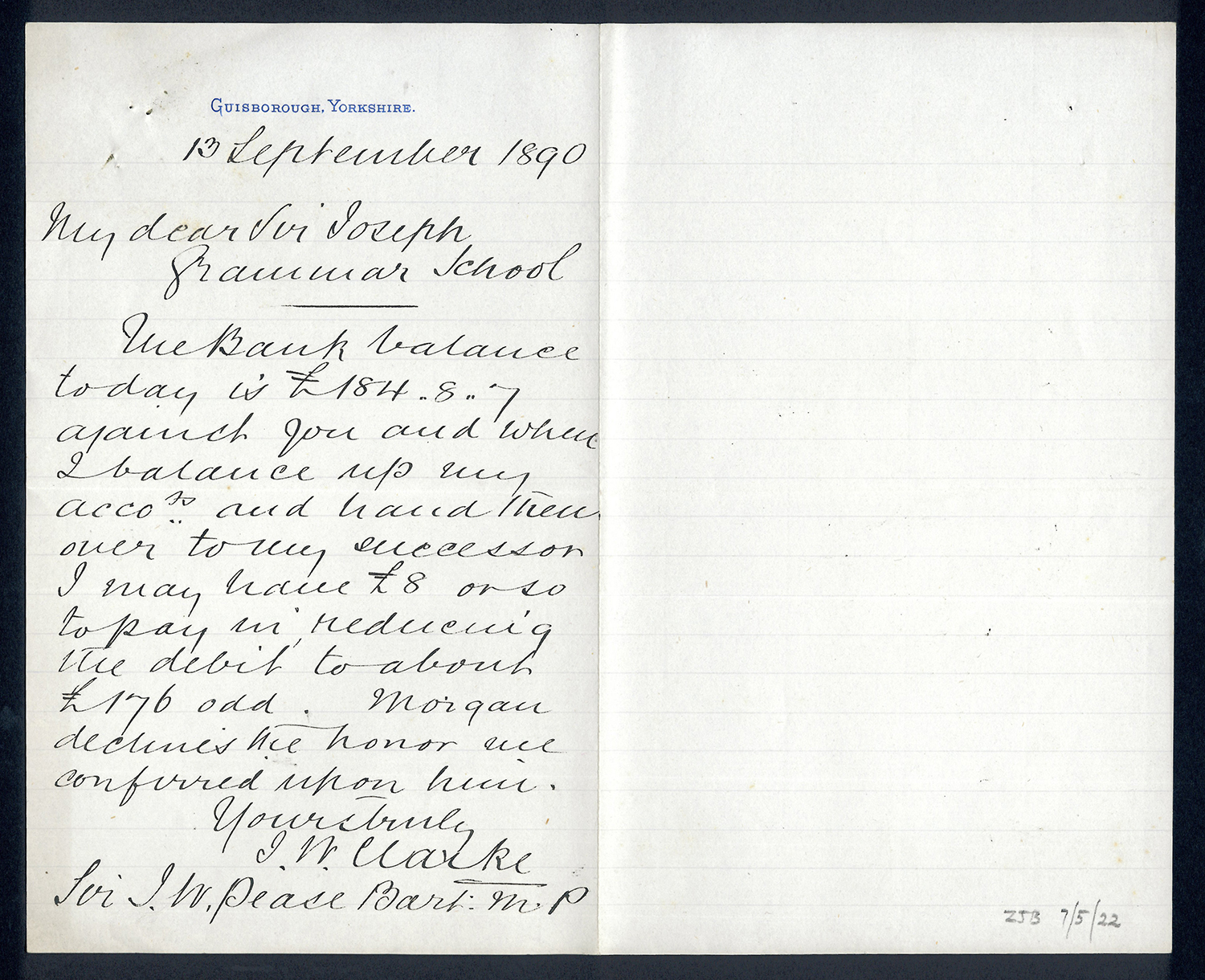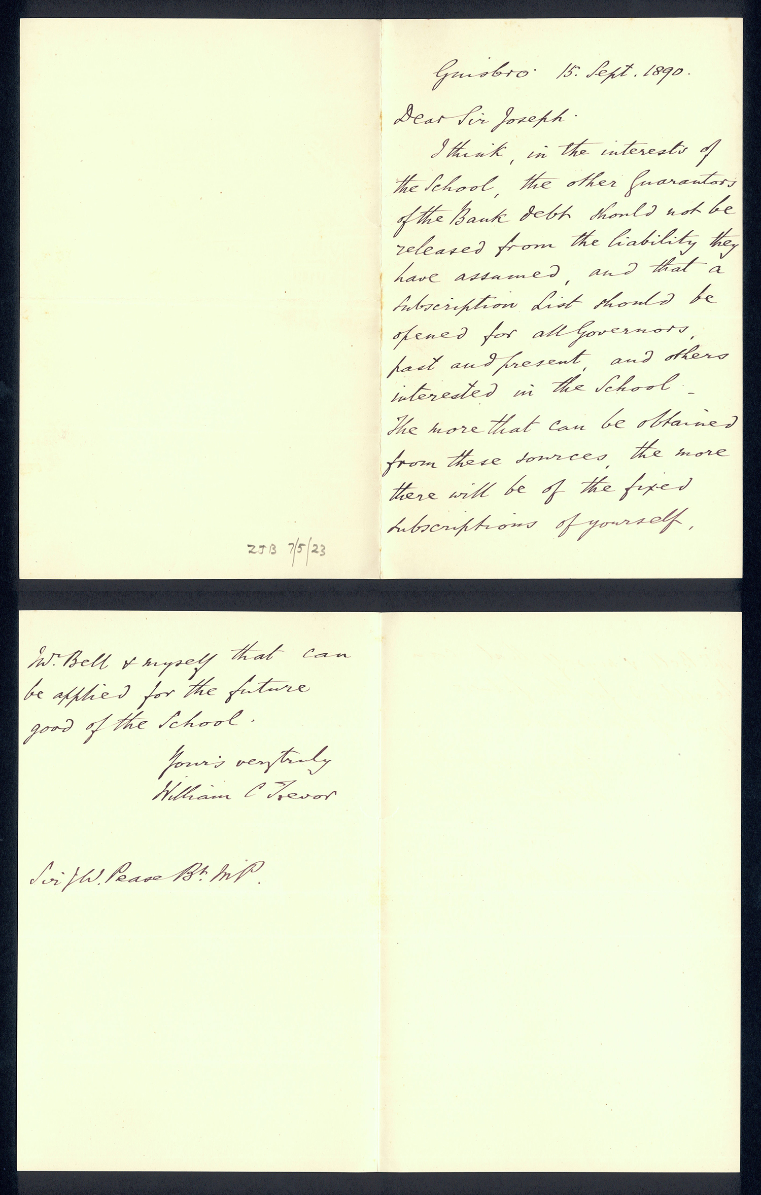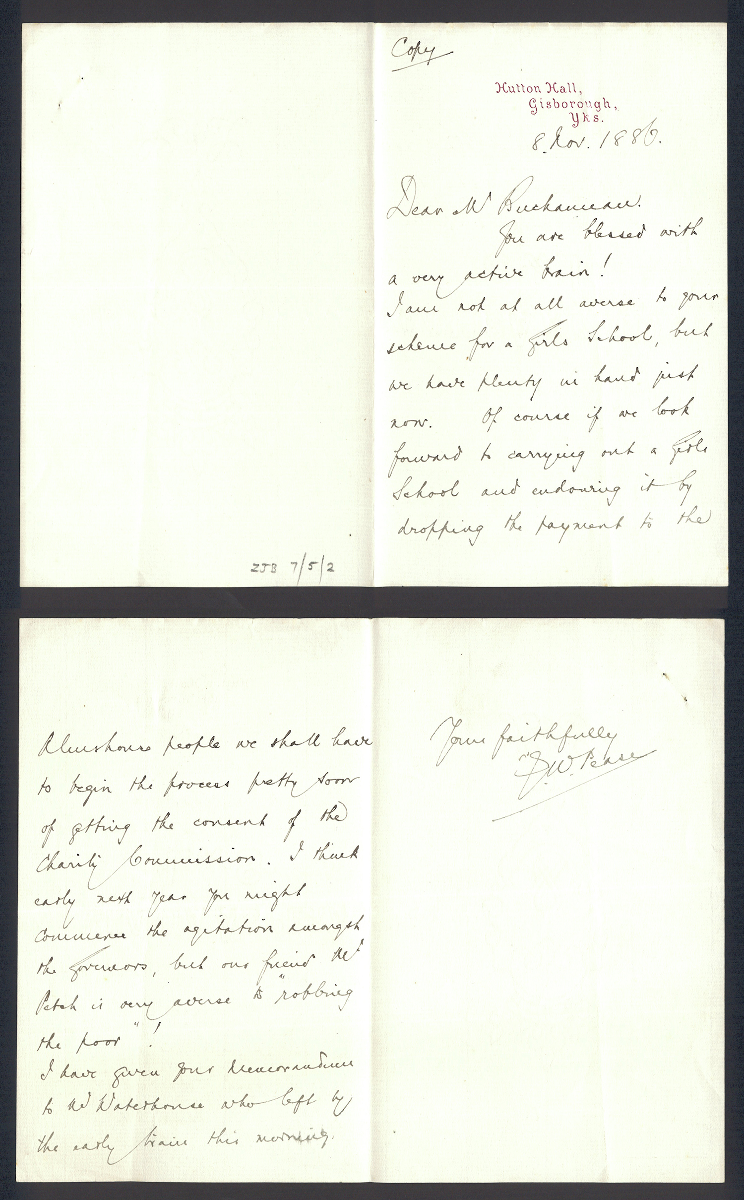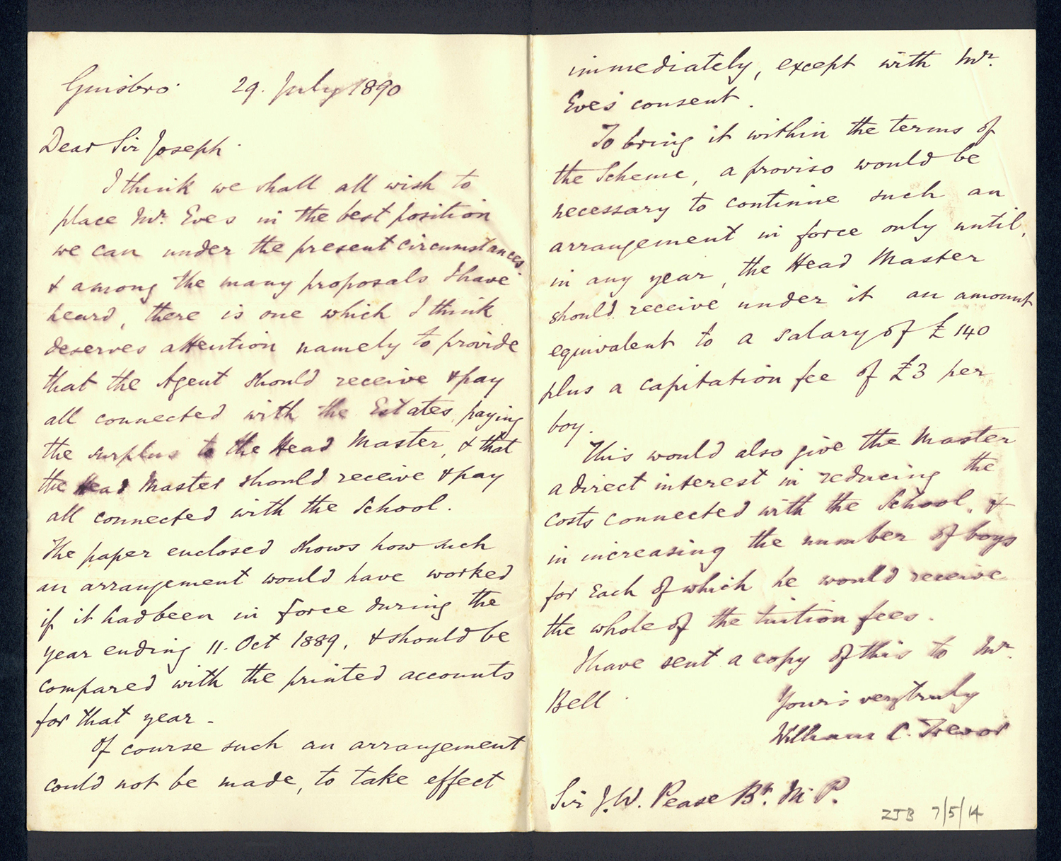 Sir Joseph Pease was the guiding force beind the reconstitution of Guisborough Hospital into Guisborough Grammar School in the 1880s. These letters date from 1886 to 1900, and form an interesting record of the very early years of Guisborough Grammar School.