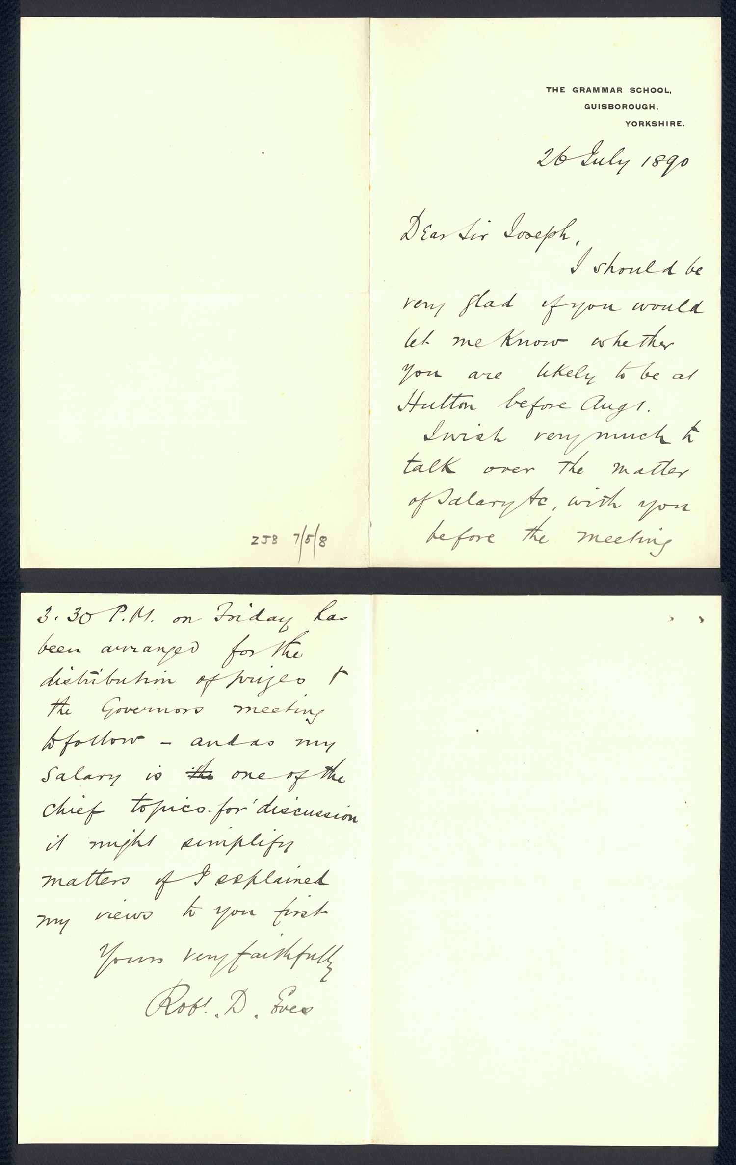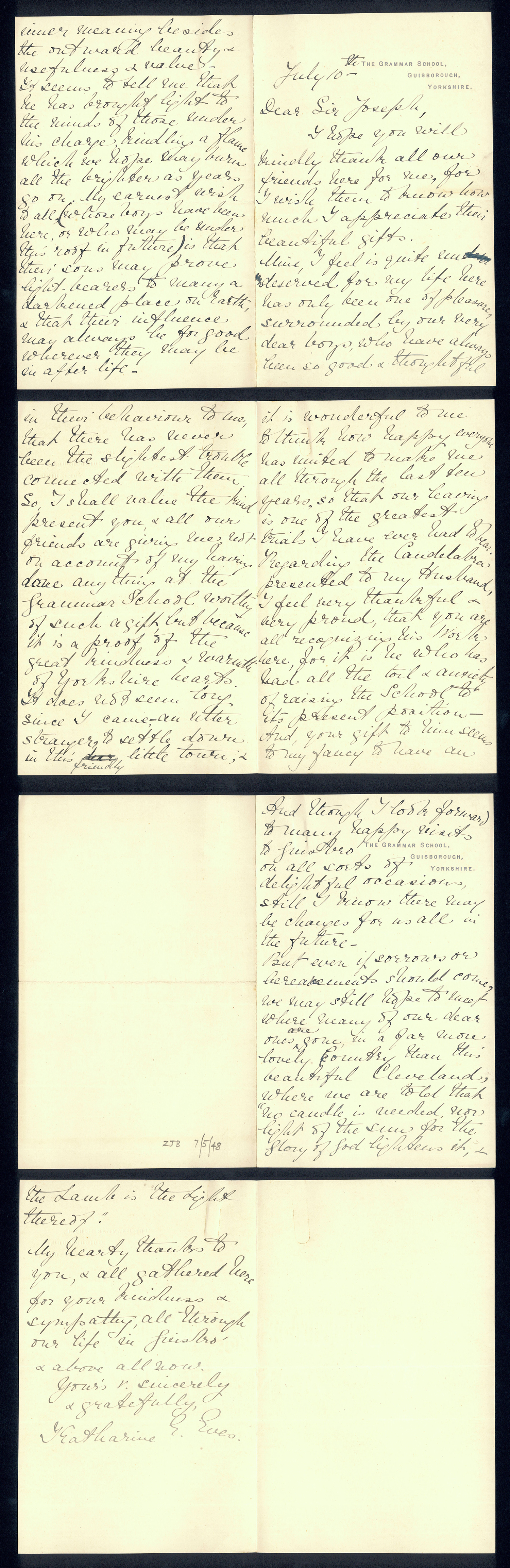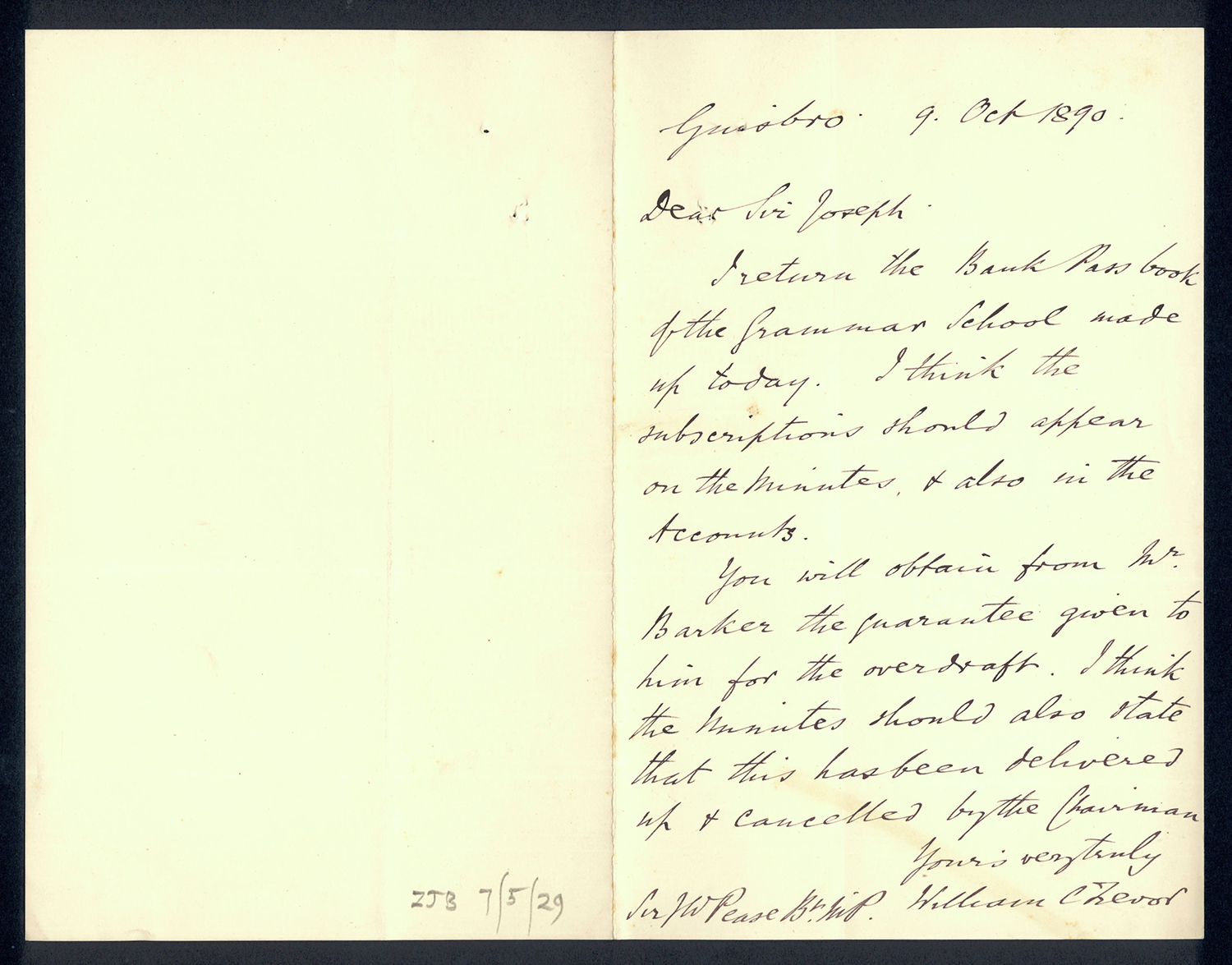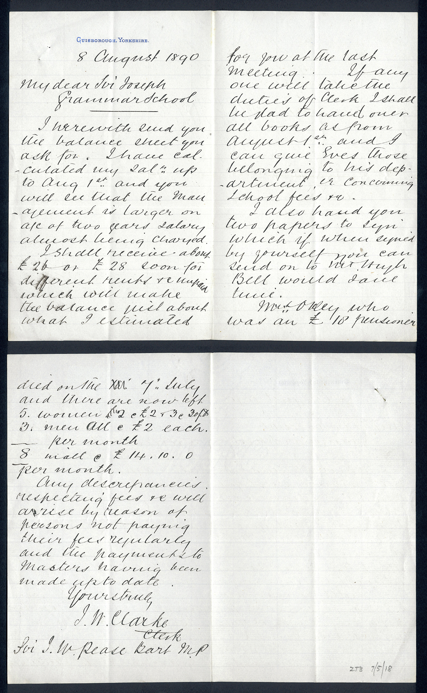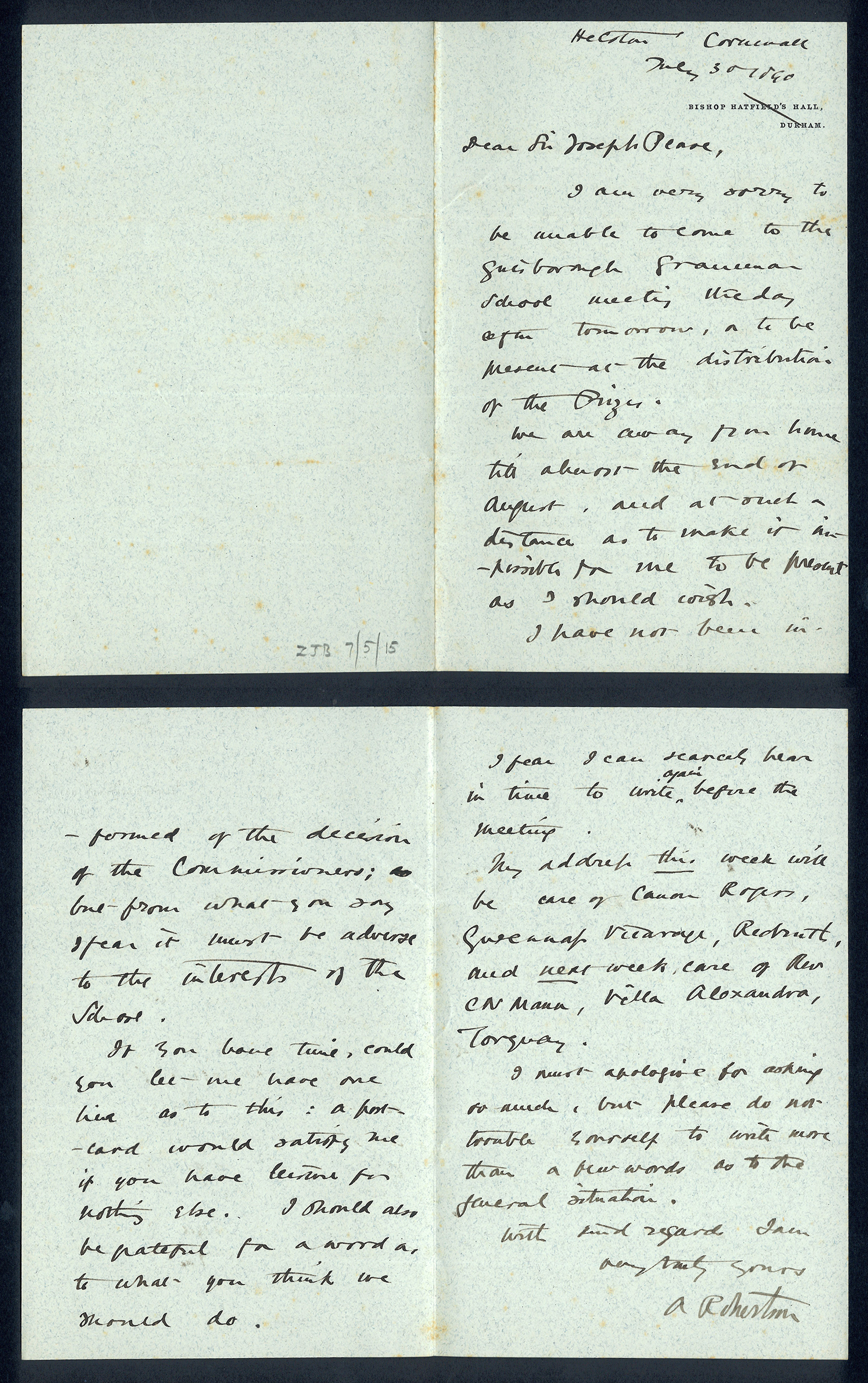 Sir Joseph Pease was the guiding force beind the reconstitution of Guisborough Hospital into Guisborough Grammar School in the 1880s. These letters date from 1886 to 1900, and form an interesting record of the very early years of Guisborough Grammar School.