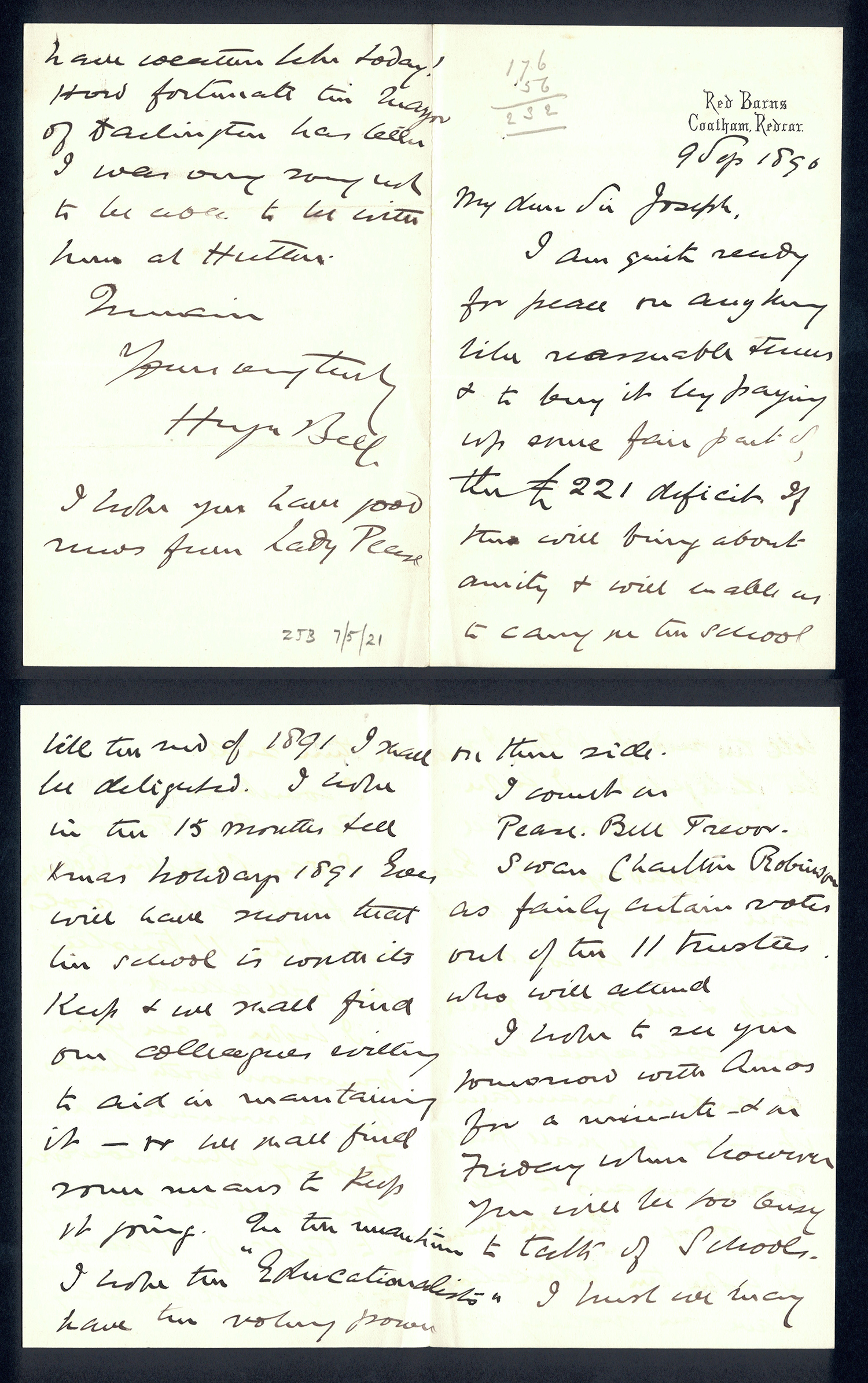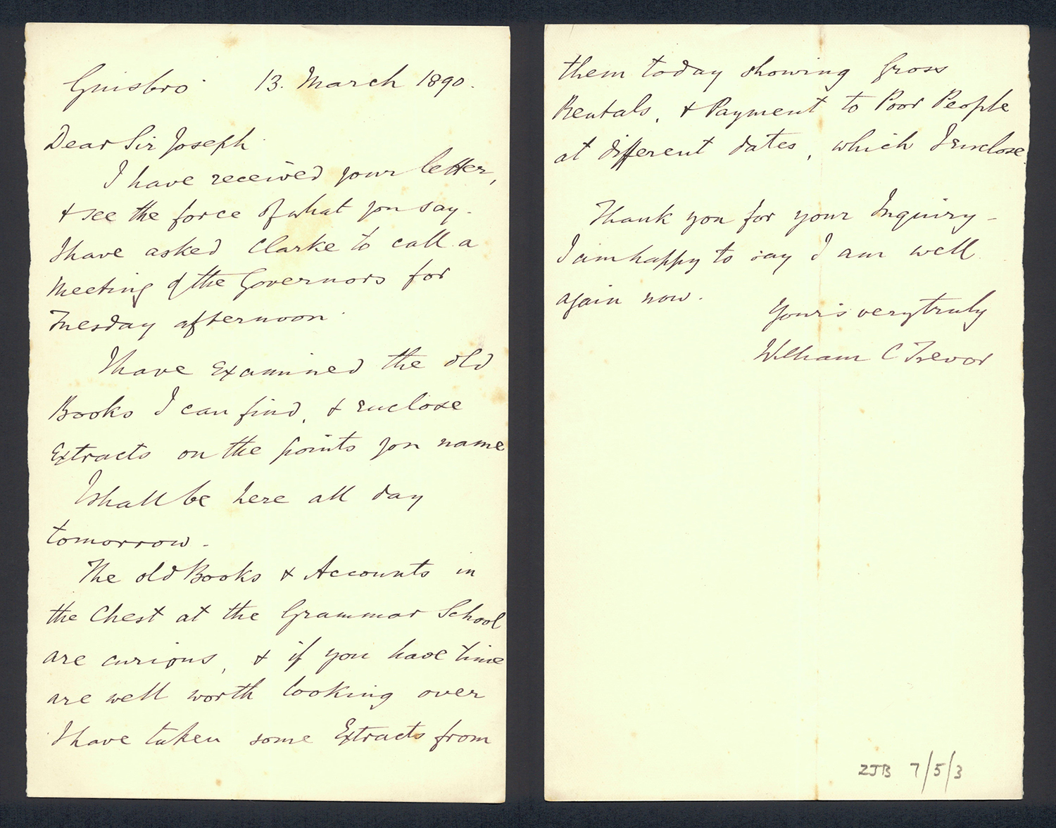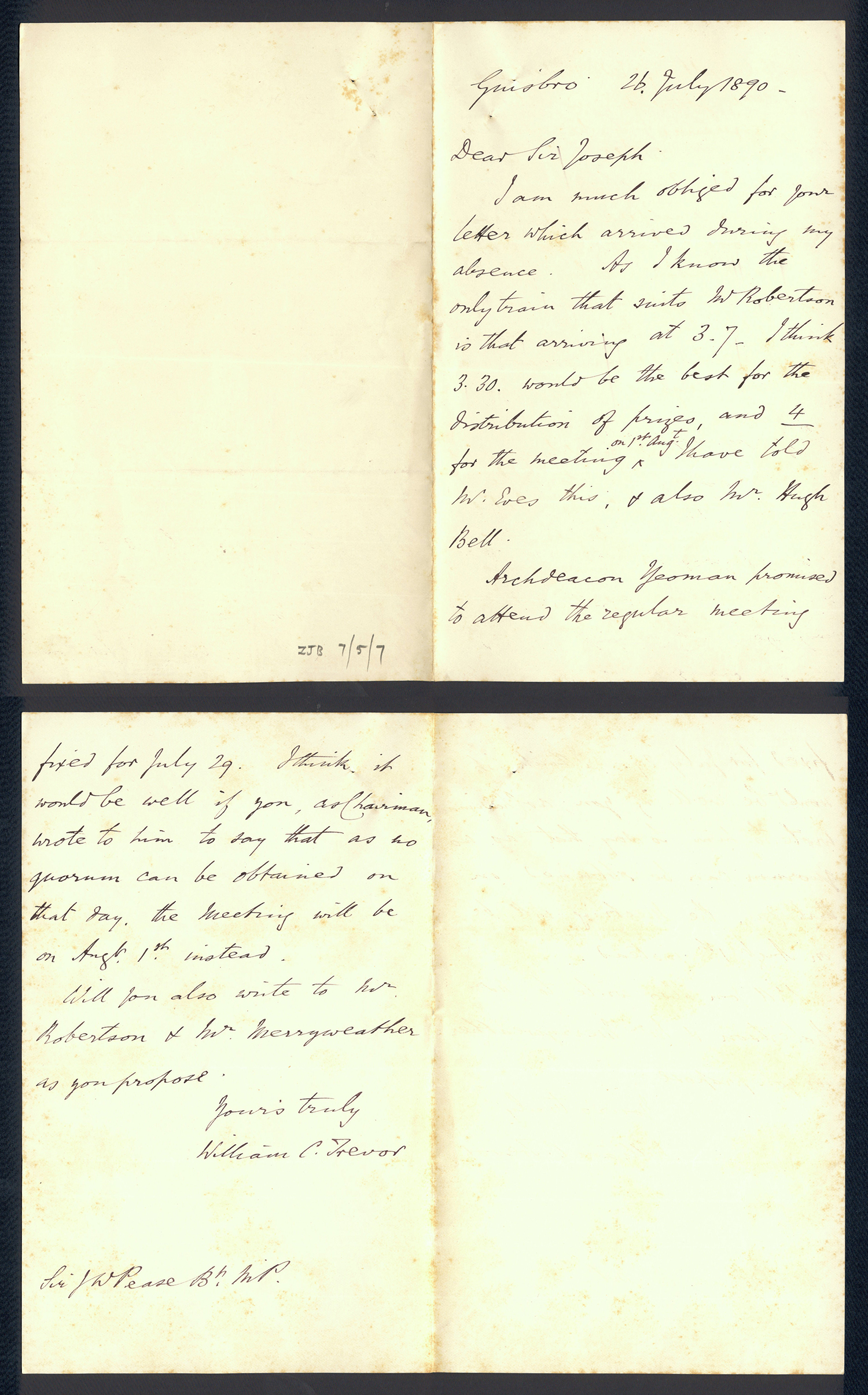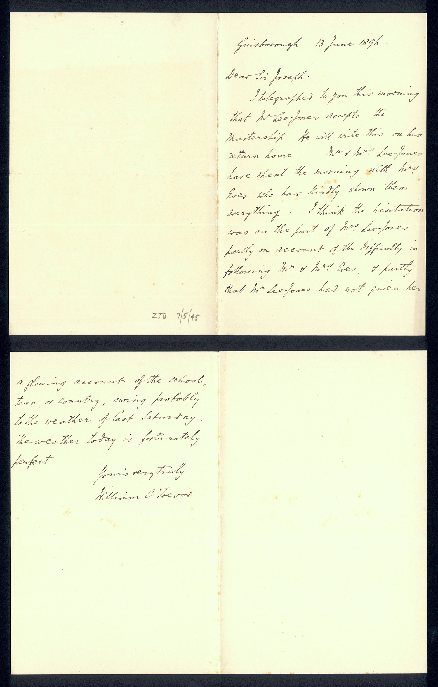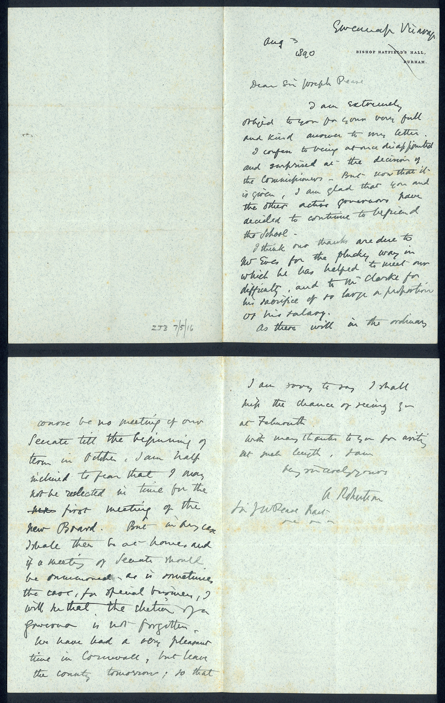 Sir Joseph Pease was the guiding force beind the reconstitution of Guisborough Hospital into Guisborough Grammar School in the 1880s. These letters date from 1886 to 1900, and form an interesting record of the very early years of Guisborough Grammar School.