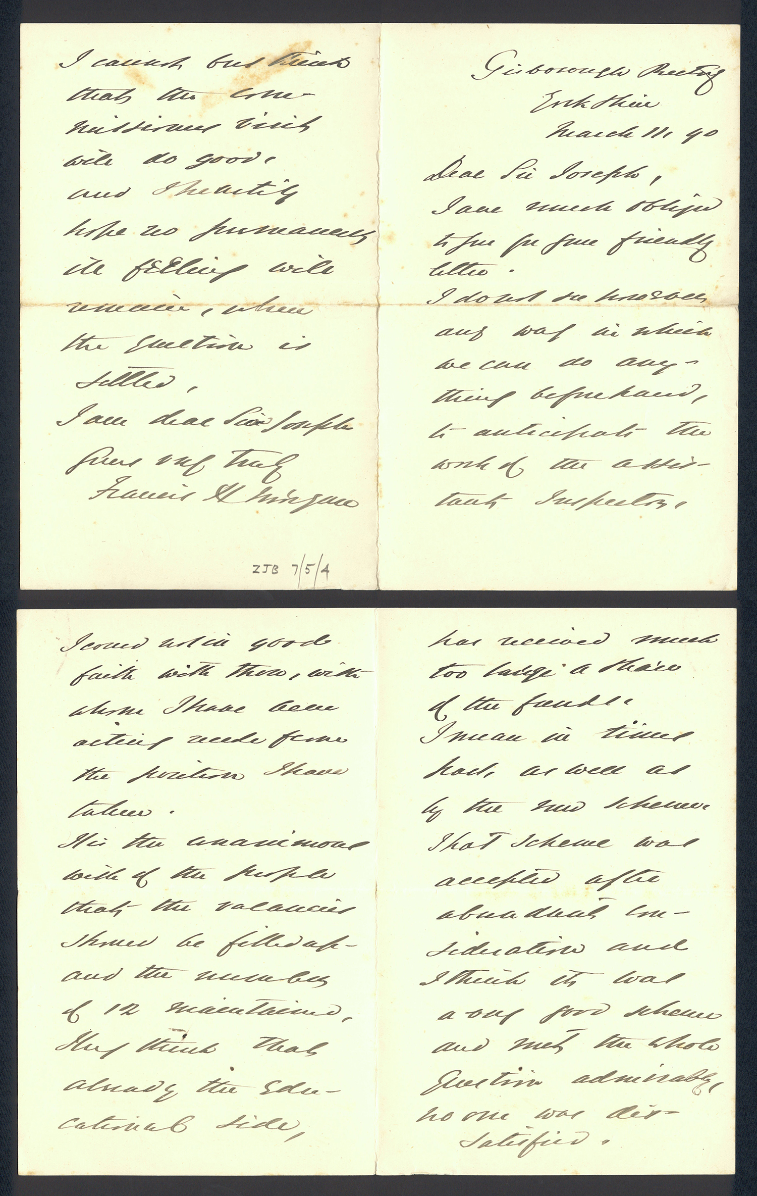 This collection has a very few copies of outgoing correspondence, such as ZJB 7-2-4, which concerns the end of Robert Frankland's time at the school due to his mental ill health (Frankland was confined to a lunatic asylum near York). These copies are in the minority, however, and it seems that most everyday correspondence was not considered important enough to copy.