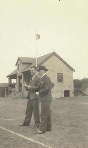 Z64, Talking in front of the cricket pavilion, undated
