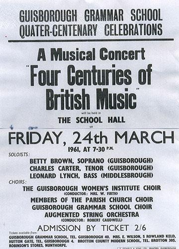 In 1561, Guisborough Grammar School celebrated its 400th anniversary. The service of commemoration was held in Gisborough Priory, on the site of the chancel of the Priory church.