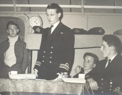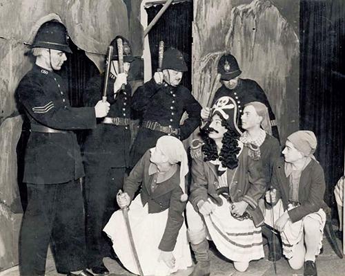 This photo shows Tony Wealleans as the Pirate Maid of Work, Mr Arnott as Major General Stanley and J B Snowdon as The Pirate King