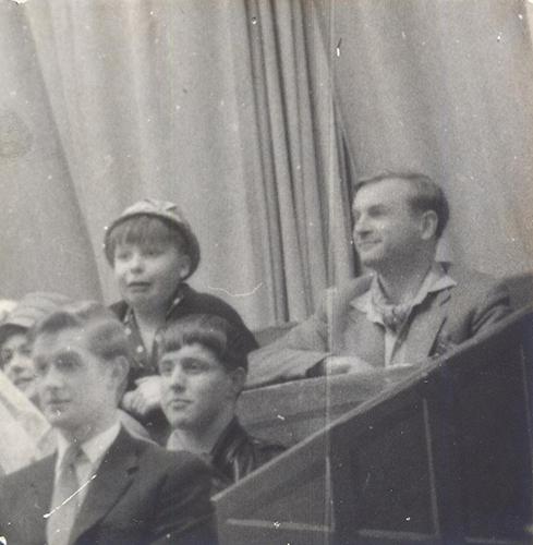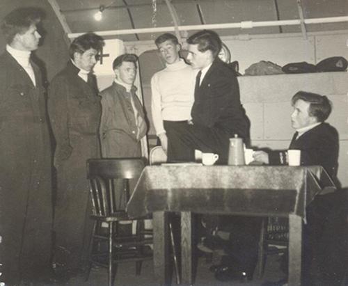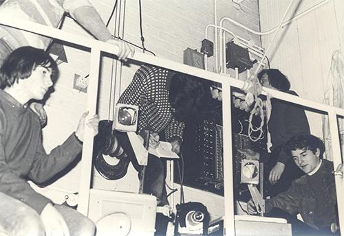 A photograph of a production in the 1960s or 1970s showing the lighting engineers at work