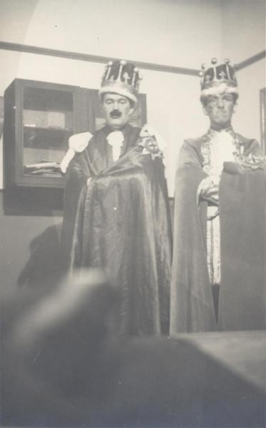 The photo shows staff member Mr I Thomas in costume and two other actors