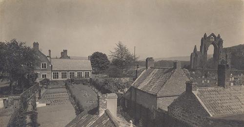 This photograph probably dates to the 1960s, and shows the west end of the grammar school, the east end of Gisborough Priory, and the cottages and gardens between the grammar school and the church.